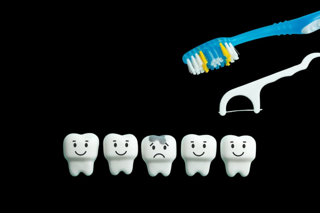 Причины те же: бактерии в налёте, сладкое, нерегулярная гигиена. На ранней стадии кариес можно заметить по белым или тёмным пятнам на зубе; позже появляется «дырочка», боль от сладкого и холодного.