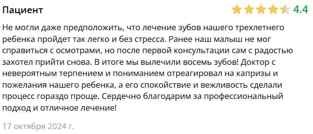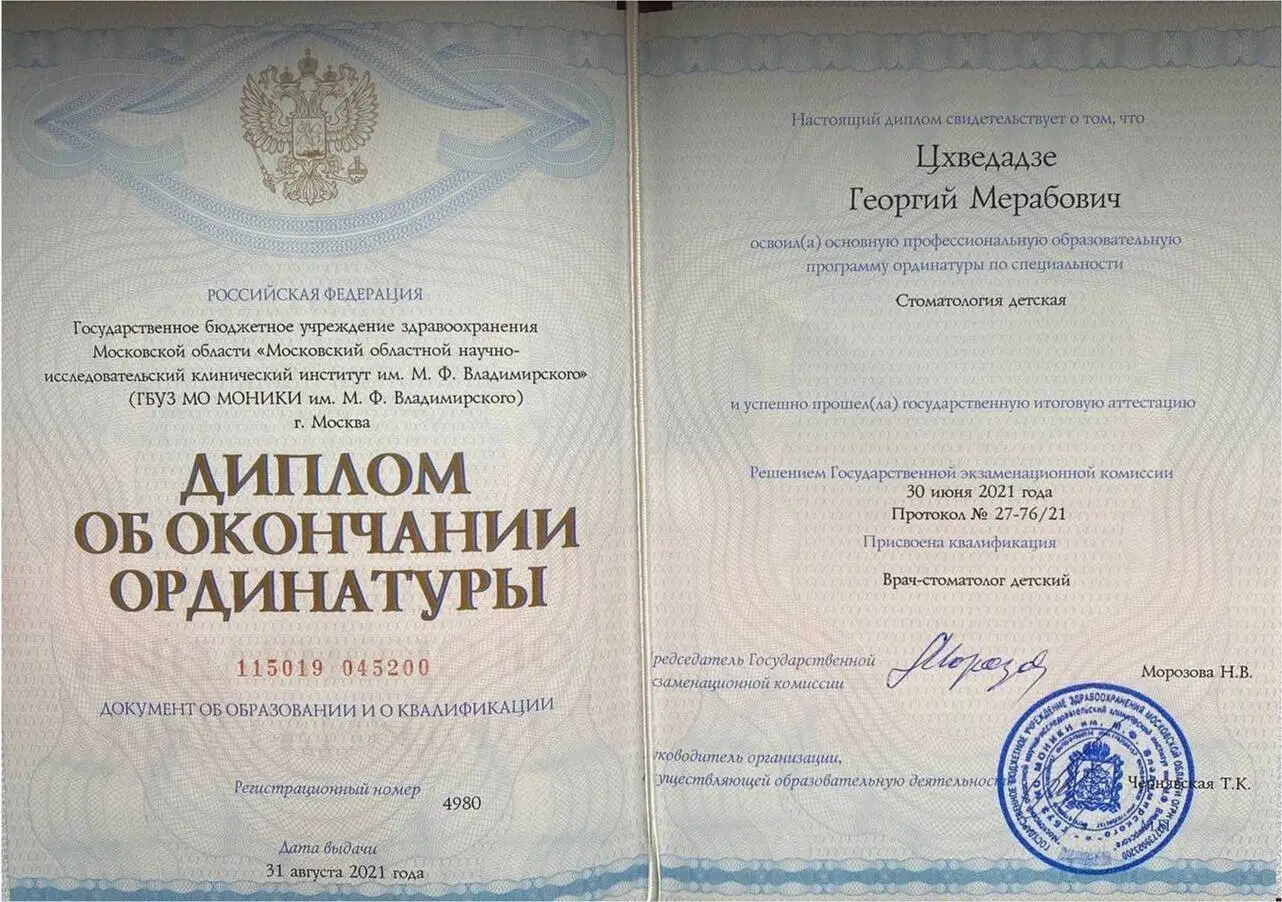 ✓окончил ординатуру в Московском областном научно-исследовательском клиническом институте им. М. Ф. Владимирского по специальности Детская стоматология