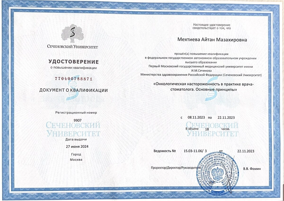 ✓Прошла повышение квалификации по направлению «Онкологическая настороженность в практике врача-стоматолога. Основные принципы» - Первый Московский государственный медицинский университет имени И.М. Сеченова
