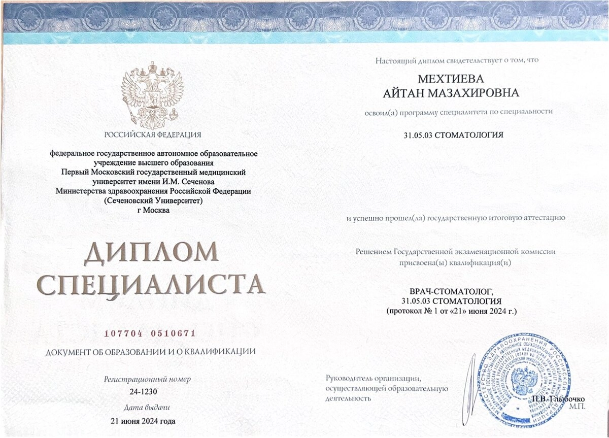 Постоянно прохожу курсы и мастер-классы, совершенствую профессиональные навыки в области терапевтической стоматологии и эстетических реставраций. Сеченова