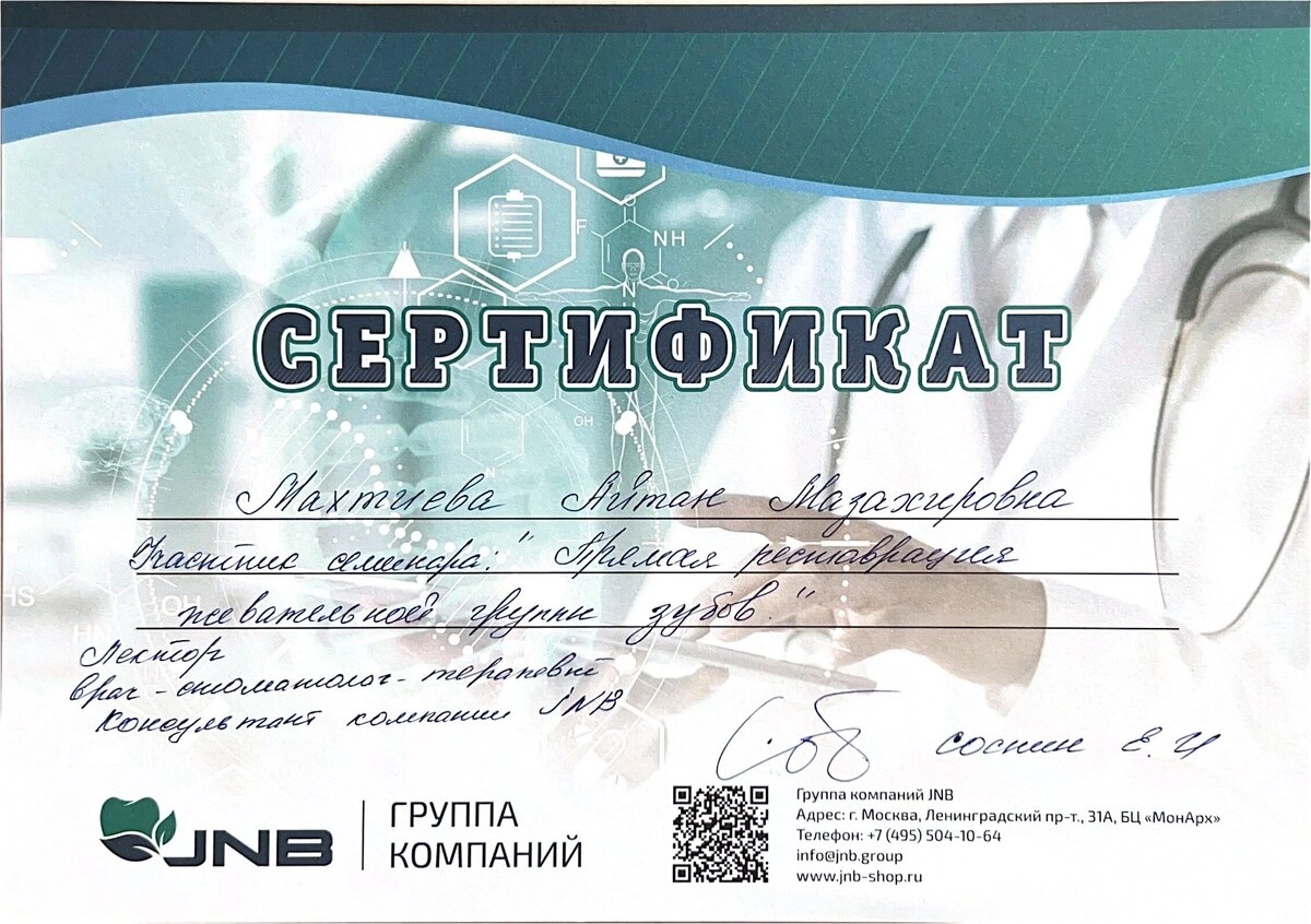 ✓прошла обучение по программе «Особенности эстетической реставрации во фронтальном отделе» - учебный центр S.T.I.dent