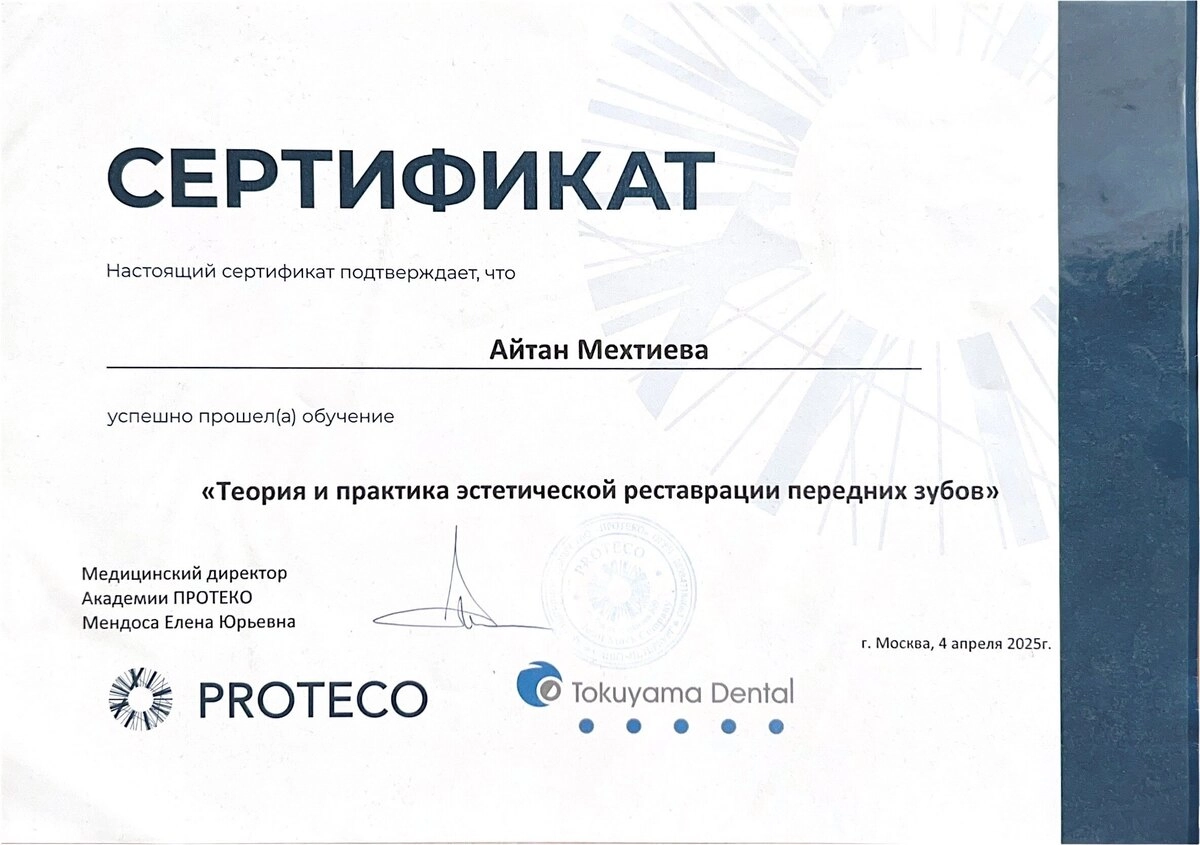 ✓прошла обучение по программе «Теория и практика эстетической реставрации передних зубов - академия ПРОТЕКО