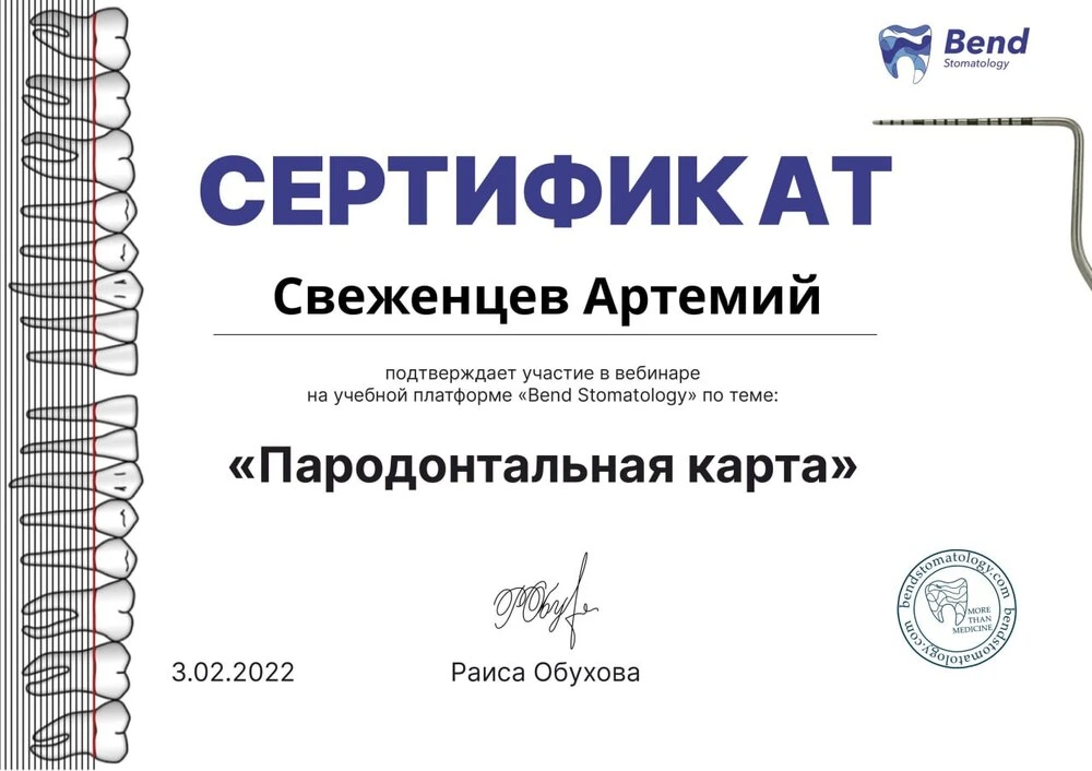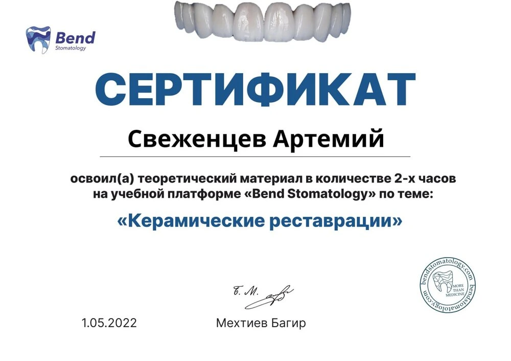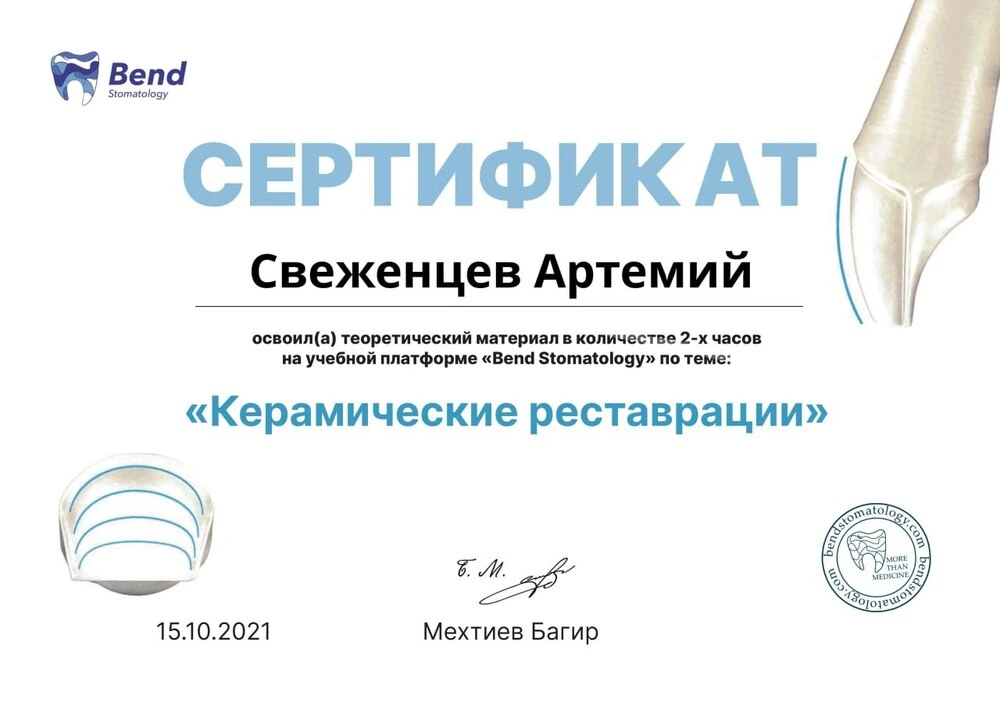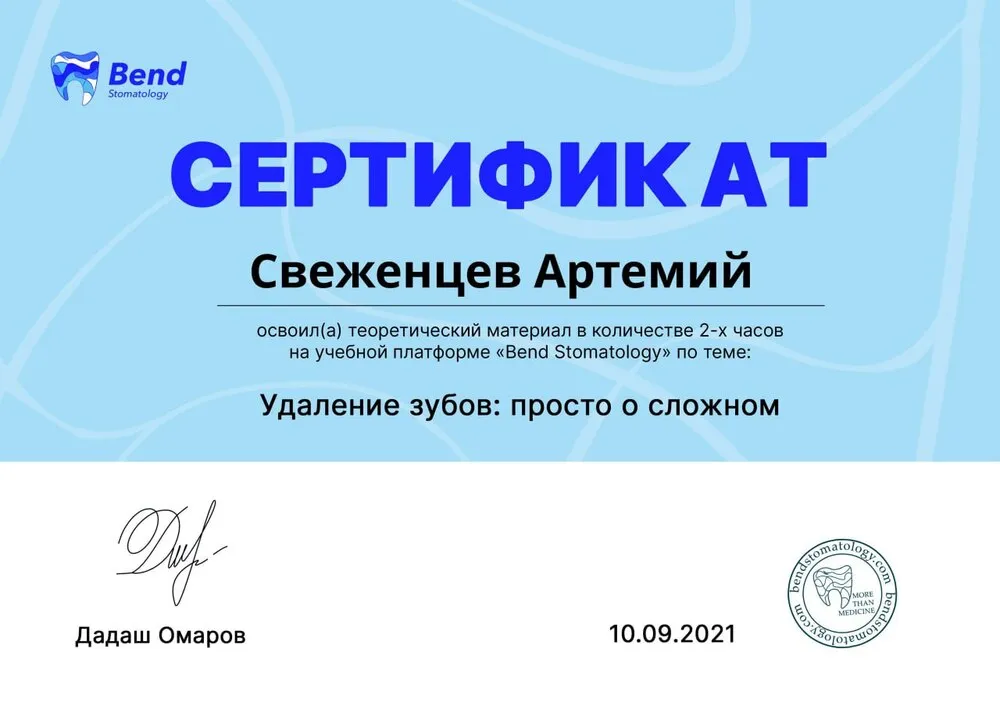 2021 год - окончил Российский университет медицины г.Москва по специальности Стоматология