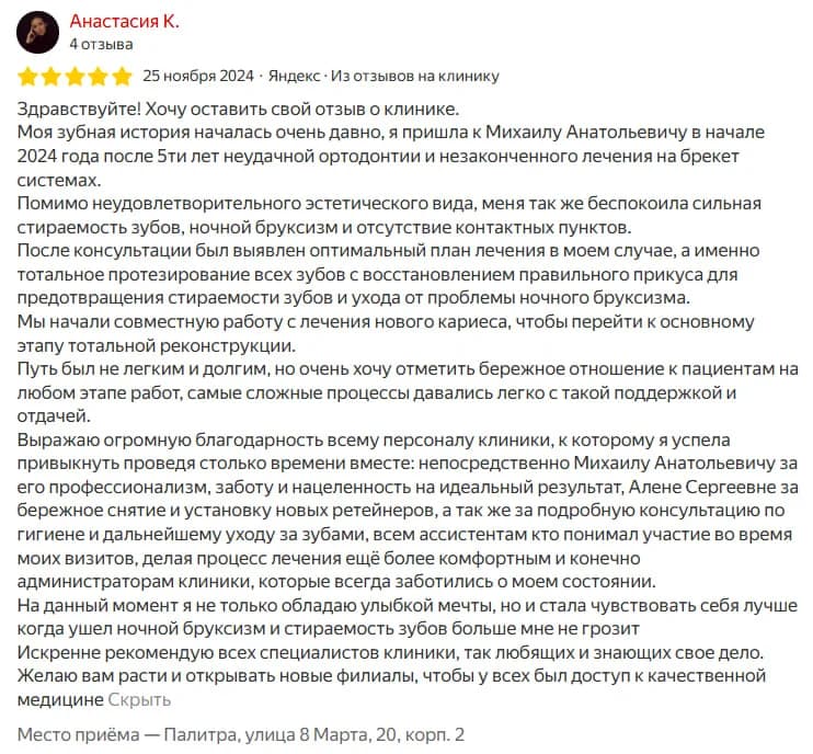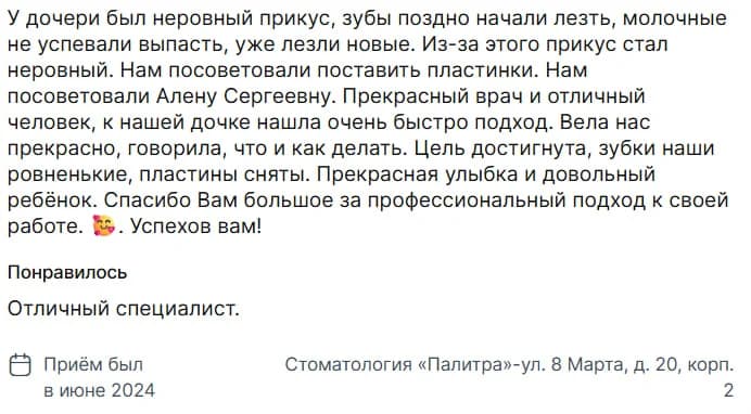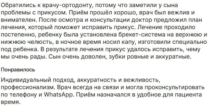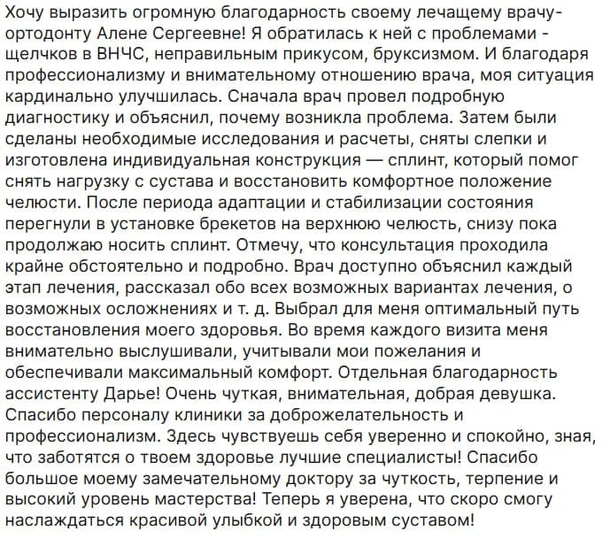 В 2021г. завершила обучение в ординатуре по специальности Ортодонтия в ГБУЗ МО МОНИКИ им. Владимирского.