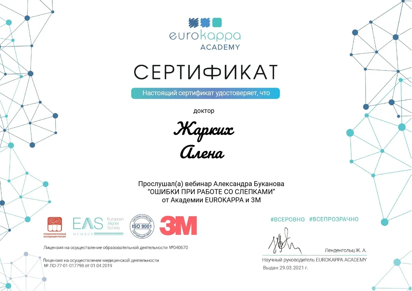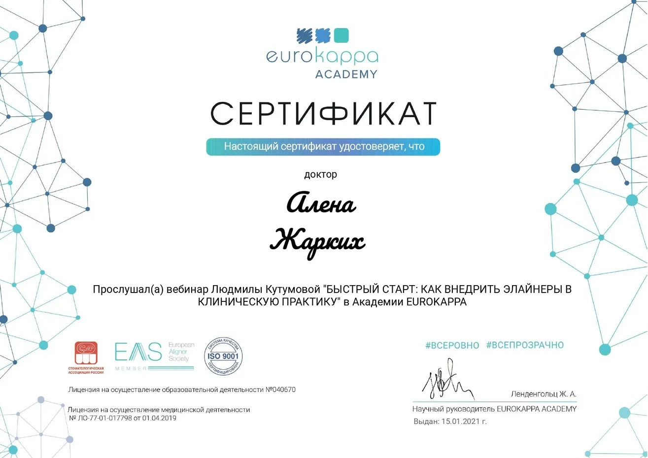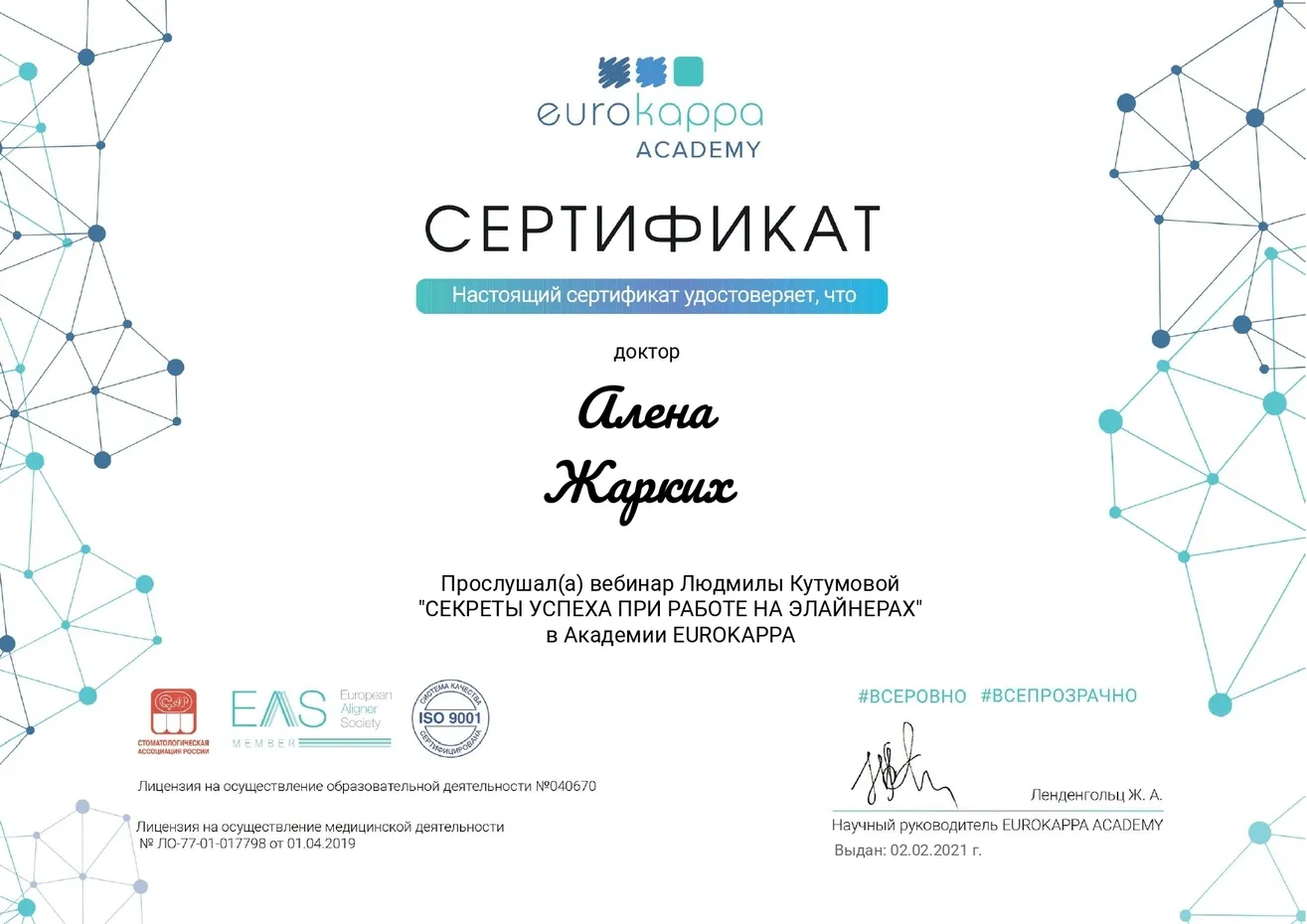 ✓приняла участие в вебинаре «Быстрый старт: как внедрить элайнеры в клиническую практику» (академия "EUROCAPPA")
