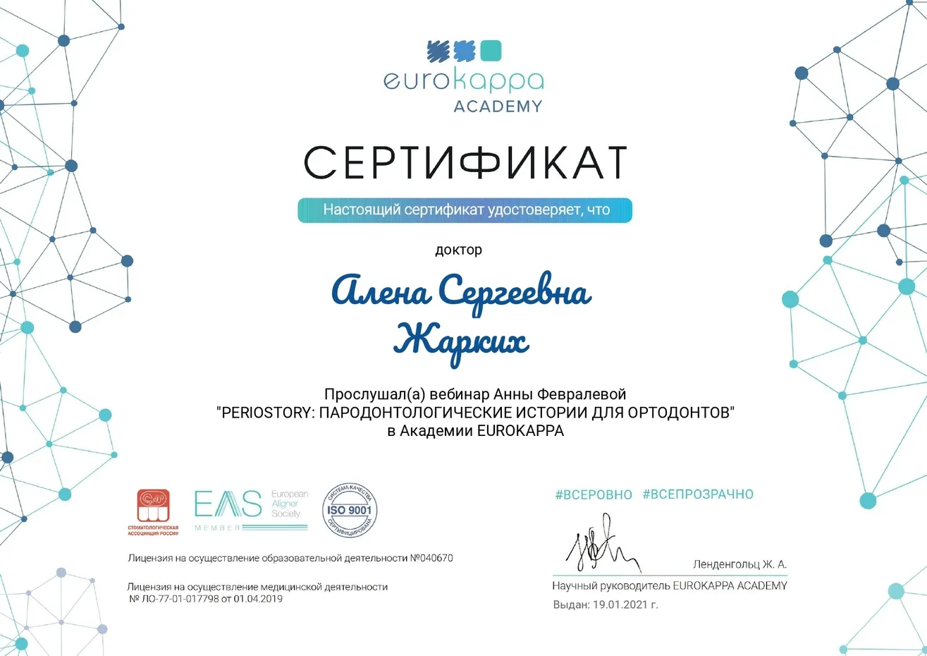✓приняла участие в вебинаре «PERIOSTORY: Пародонтологические истории для ортодонтов» (академия "EUROCAPPA")