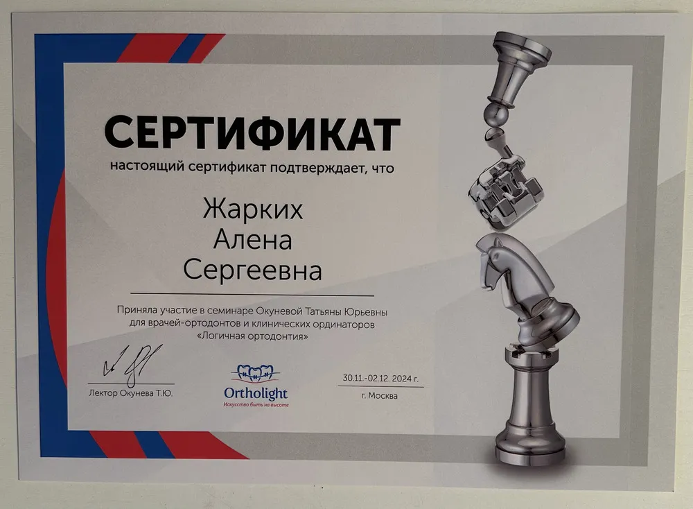 ✓приняла участие в семинаре Окуневой Татьяны Юрьевны для врачей-ортодонтов и клинических ортодонтов «Логичная ортодонтия» (Академия Ортодонтии "Ortholight")